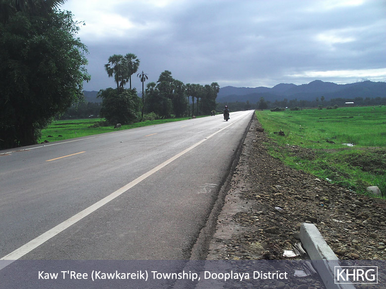 The second two photos were taken by a KHRG community member on July 22nd 2015, between Myawaddy and Kawkareik Town, Kawkareik Township, Dooplaya District and show a section of the Asian Highway. An opening ceremony for the Highway was planned by the Thai and Burma/Myanmar governments, scheduled to take place on July 20th 2015, but the plans were cancelled due to the fighting that took place between the DKBA and Tatmadaw soldiers. The fighting erupted after Tatmadaw soldiers tried to take control of the Highway ahead of the planned ceremony. [Photos: KHRG]
