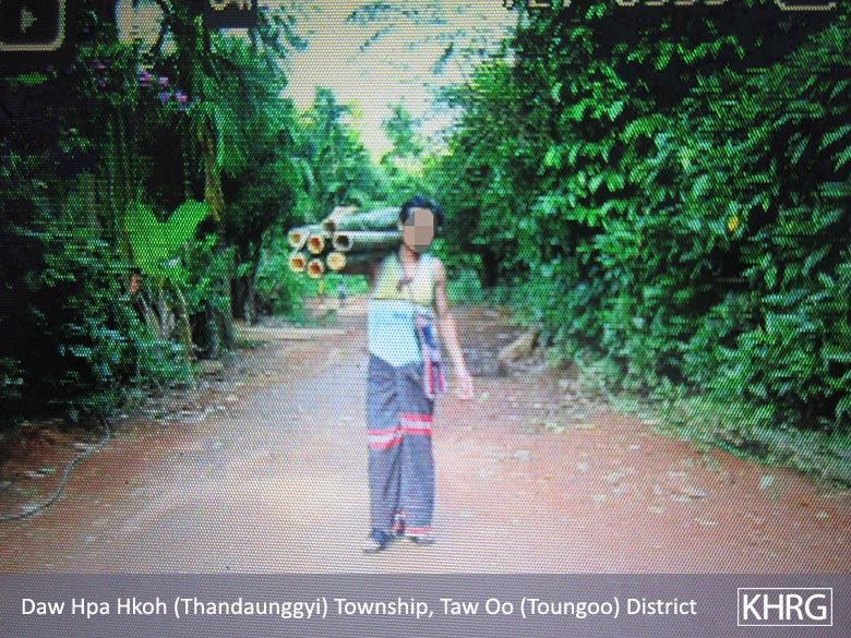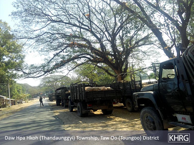 The security troops beside the road have to do not only security duties but also they have to find any required bamboo and trees for their mother [headquarter] army camp. There are 15 military cars which carried rations and foods transporting to Htantabin Township, Toungoo District. On January 29th 2016 they also sent rations to Thandaunggyi Town.