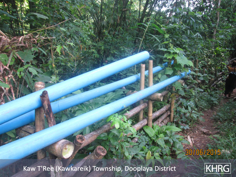 These two photos were taken by a community member on June 30th 2015 and July 1st 2015 respectively in C--- village, Kawkareik Township, Dooplaya District. The first photo shows pipes that were placed on a villagers’ plantation fence to transfer water from a river to the village. The second photo shows a pipeline that was dug under a C--- villager’s house to transfer water to K--- village. Because of the water situation, there is social conflict between the two villages, because K--- villagers planned to transfer and get the water from C--- village’s stream. C--- villagers currently use and consume this water, and the water pipe was laid without consent from C--- villagers. K--- villagers received support from the Burma/Myanmar government for the water pipeline. C--- villagers raised their concern that they will face with water shortages in the future, especially in summer, because water from C--- stream will be reduced year-by-year if it is siphoned to K--- village. [Photos: KHRG]