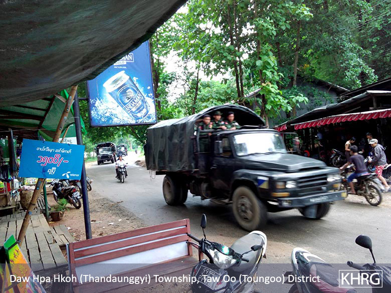 On August 11th 2016, 17 military trucks which were full of Tatmadaw soldiers from Toungoo were sent to the army camps in the east of Thandaunggyi Township. They also transported military weapons to the army camps in the east of Toungoo. It concerned local villagers as [they saw the transportation of military weapons] a threat.