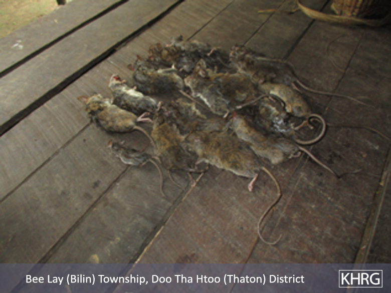 Civilians in Aee Soo Khee village tract and Htee Maw Khee village tract, Bilin Township, faced an extreme mice attack on their paddy [during the 2016 growing season]. The civilians in Aee Soo Khee village tract and Htee Maw Khee village tract mainly do cultivated hill farming for their livelihood and they live in rural mountain villages. Since the beginning of 2016 a lot of bamboo has been producing fruit, so there have been a lot of mice coming [to eat it]. Therefore, after the villagers planted the paddy in the rainy season, the mice ate all the paddy seeds and young paddy plants.