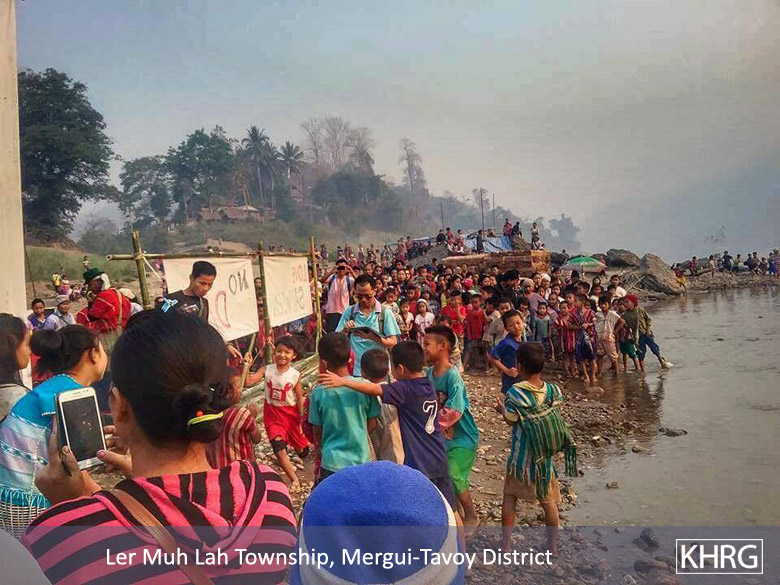 These pictures were taken in April 2017, Moh Roh village, Htee Moh Pya area, Ler Muh Lah Township, Mergui-Tavoy District. The pictures were taken when villagers were holding an environmental event organised by Thara Fleh Kay who works for a community based organisation (CBO). Around 200 people from about 10 villages participated in this event. The purpose of holding this event is to take action to protect the environment and to ensure the sustainability of the Tanintharyi River. The picture on the right includes the signboard which has written on it (upside down) ‘No Dam’. The event took place at Moh Roh village on the Tanintharyi River bank which is 2.7km downstream from the proposed dam site. [Photos: Southern Youth]