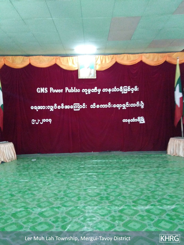 The hydropower project is proposed to be constructed around Moh Roh village on the Tanintharyi River. A local villager from one of the affected villages, Saw C---, participated in a dam consultation meeting conducted by the Thai company Greater Mekong Sub-region Power Public Company Limited (known as GMS Power or GMS) who have taken on leadership of the potential dam project. Other villagers who will likely be impacted by the construction of the proposed dam also attended the consultation meeting.