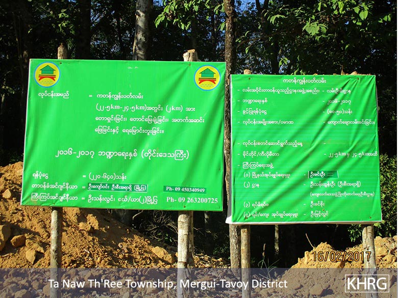 • In B--- village, Ta Naw Th’Ree Township, Mergui-Tavoy District, the Burma/Myanmar government Ministry of Construction has led a road construction project for four years. They did not hold a consultation meeting with the villagers or ask permission from the land owners before they started the road construction project.
