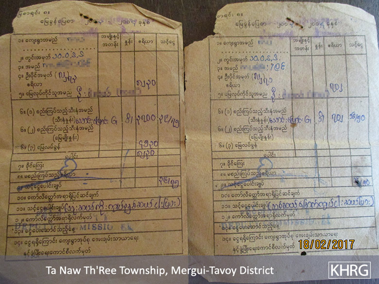 [7] After further follow up after this interview, KHRG researchers learned that Saw A--- does not have a land title for his land but only a land tax receipt. In this interview, he incorrectly referred to his land tax receipt as a ‘land title.’