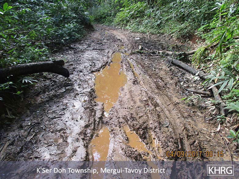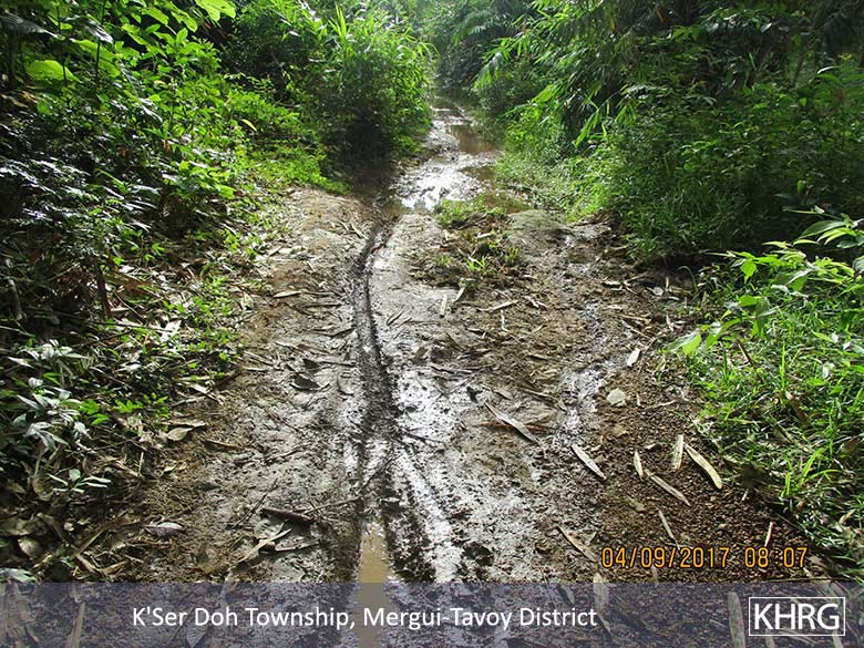 The first five photos were taken on September 4th 2017 in between Wa Daw Hkoh village and Noh Hpa Doh village. They are of a section of the road in Kleh Muh Htee area, K’Ser Doh Township, Mergui-Tavoy District. Regarding this road, local people reported to the township [K’Ser Doh] government authorities [that it needed to be repaired] in early 2016, but there has been no response yet. Travelling on this road during raining season is troublesome for villagers who are finding food [in the forest or in town], [students] to access schools and [sick people] to access healthcare facilities.