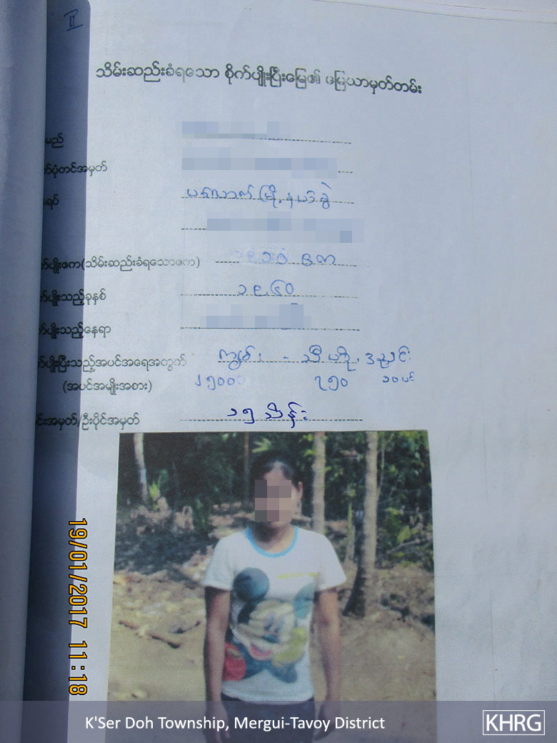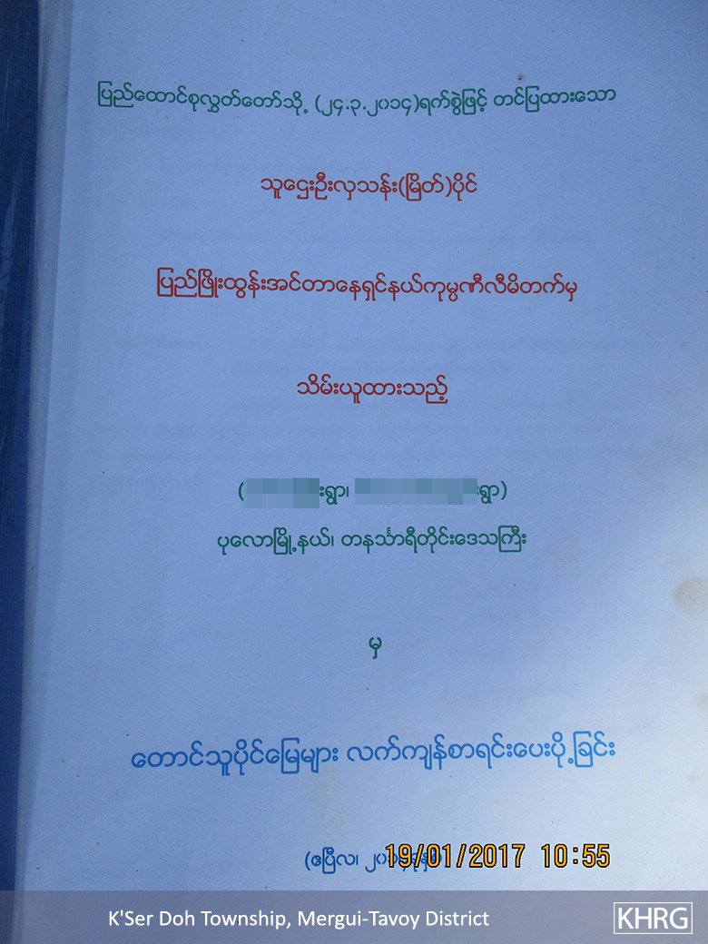 These photos were taken on January 19th 2017 in Noh Hpa Doh village, La Baw area, K’Ser Doh Township, Mergui-Tavoy District. These photos show documents that contain details of land confiscated by Pyi Phyo Htun Company. The first photo is the cover of villagers’ complaint letters to the Burma/Myanmar government regarding land confiscation. The second and third photos are of villagers whose plantations were confiscated and were paid unfair compensation. The land owner in the second photo did not accept the unfair compensation, but the land owner in the third photo accepted compensation of about 1,500,000 kyats [$1,128 USD] per ten acres of plantations that had more than 3,000 plants. The last photo shows the names of villagers whose lands were confiscated. In this case, more than 40 villagers had to give up hundreds of acres of their lands without knowing any information. Some villagers do not have a place to stay anymore and they have to stay on other people’s lands. On the other hand, villagers are trying to get back their lands and they submitted complaint letters to the Burma/Myanmar government. However, villagers have not received any response or returned land yet. [Photos: KHRG]