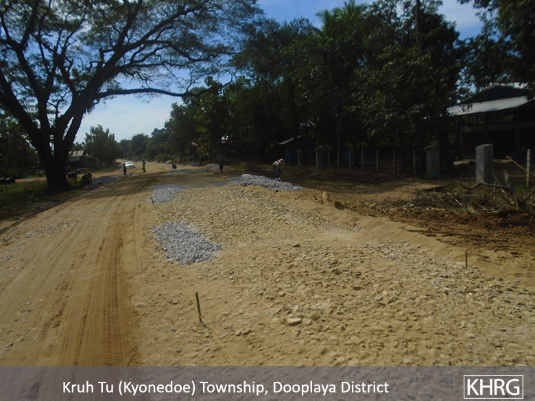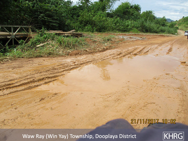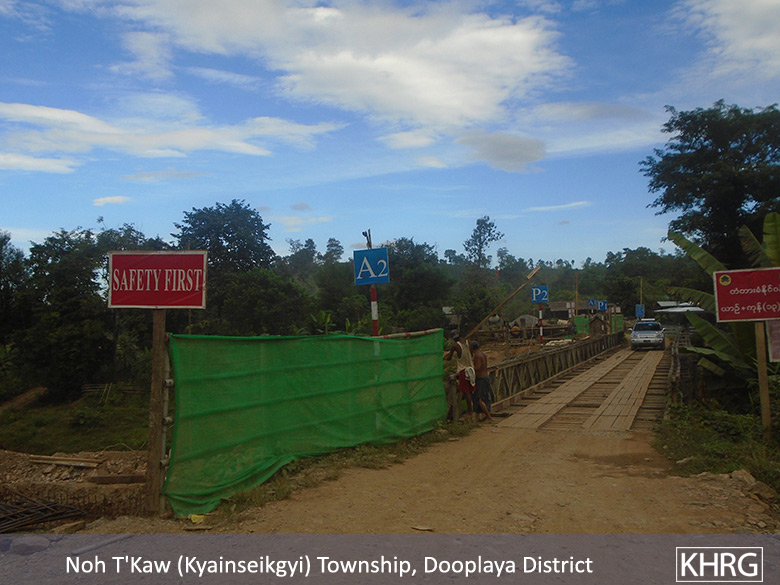 In every Township of Dooplaya District [especially Noh T’Kaw and Kyonedoe townships], the development projects being carried out include road and bridge construction in November 2017 for better transportation and traveling [in the local areas]. The construction workers on the roads and bridges [hired by Burma/Myanmar government] are highly committed in their work in order to finish quickly. They [workers] stay [set up temporary shelters] beside the road and work day and night. [As of January 2018] the construction of the roads continues. Hence, some roads are still muddy and not easy to travel on yet. However, the traveling situation has improved compared to the past.