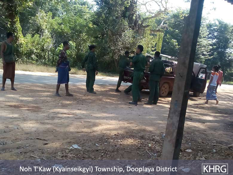 The Tatmadaw are still active in Noh T’Kaw Township, Dooplaya District. The Tatmadaw which settled in H--- village for one month [in December] now ordered a [H---] villager to take them by car to Kyainseikgyi Town [on January 11th 2018]. There were many Tatmadaw soldiers and therefore the car was full.