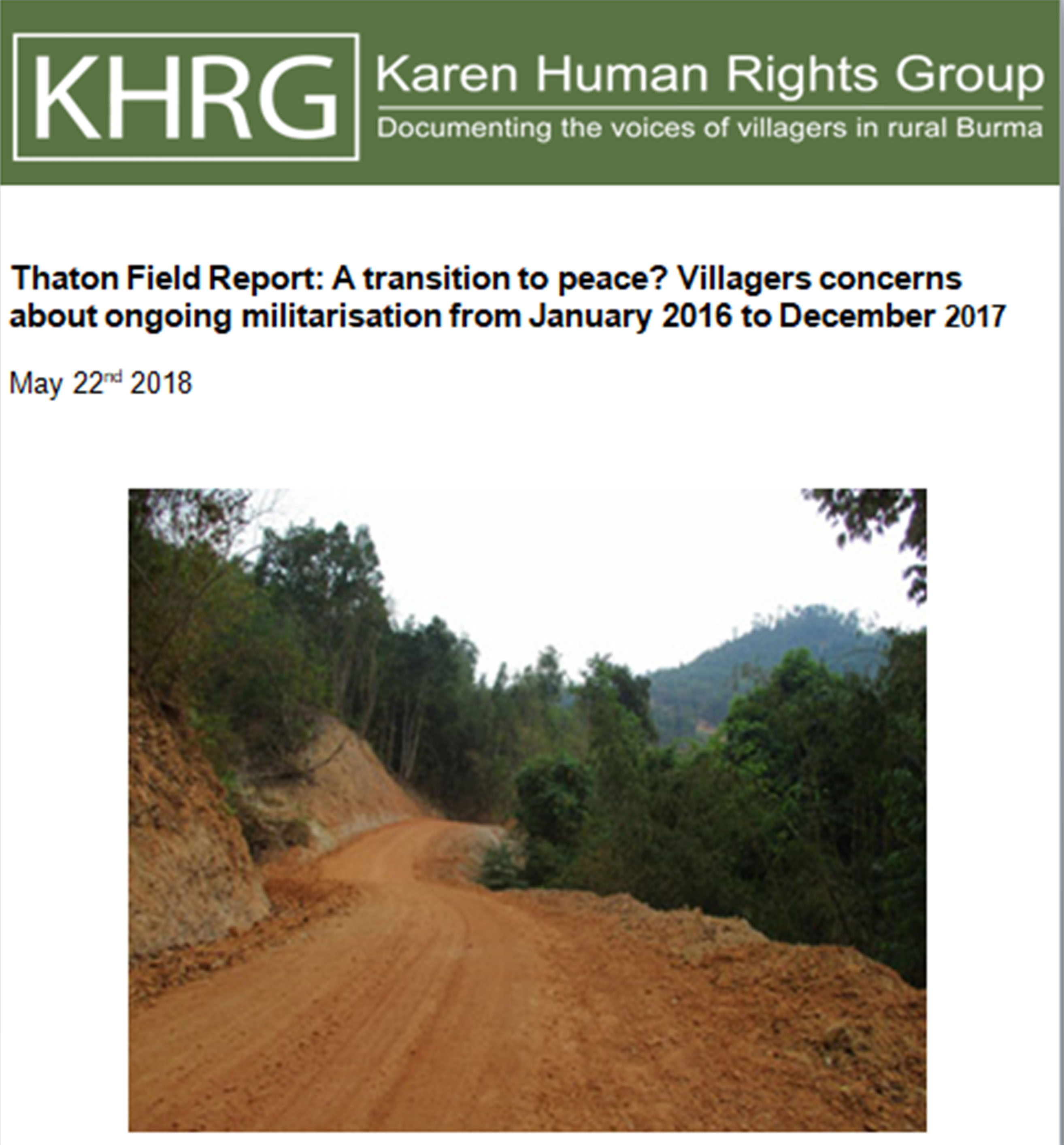 This Field Report describes events occurring in Thaton District, southeast Myanmar between January 2016 and December 2017. It includes information submitted by KHRG community members on a range of human rights violations and other issues important to the local community including the military situation in the post-ceasefire period, development projects, drug usage, ethnic and religious discrimination, and violence because of conflicts about land use.