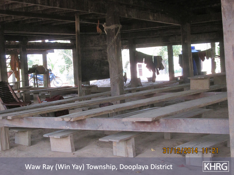 This photo was taken on December 31st 2014. It show a temporary teaching place in A’pa Lon village, Win Yin Township, Dooplaya District, which is under a monastery as there is no school in this village. In total there are 65 students from Kindergarten to Sixth Standard. The students are divided into two groups to be taught as they don’t have enough space for more classes. One group is taught under the monastery, the other group of students is taught outside. [Photo: KHRG][88]