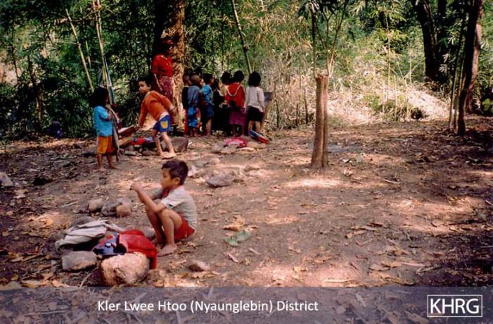 “Because the SPDC [Tatmadaw] is active near my neighbours’ village, we have had to flee from our village. The school year is not finished yet so the children have had to continue their schooling under the trees in the jungle.” Saw L--- (male, 59), L---village, Lu Thaw Township, Hpapun District/ northeastern Kayin State (interviewed in January 2007)[42]