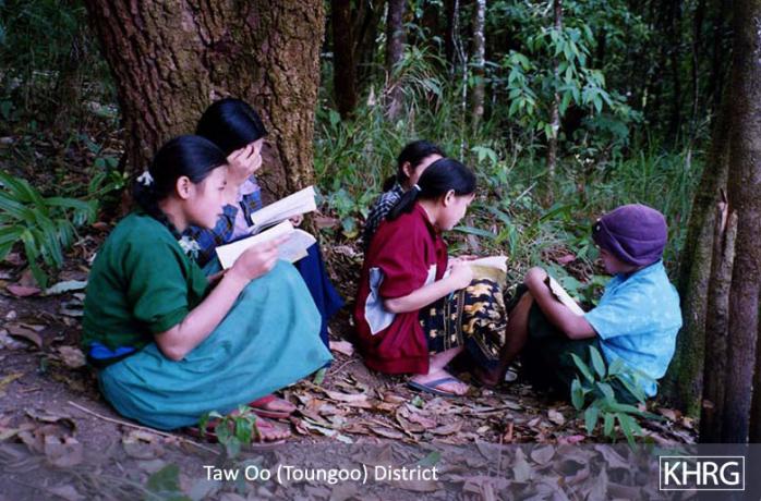 This photo taken in 2004 shows students from S--- village’s middle school in Toungoo District studying. On December 18th 2004, a column from Tatmadaw LIB #590 (commanded by Battalion Commander Ko Ko Oo), based in Tha Aye Hta, marched through several villages in the area, so the villagers fled to the forest around B--- area. Local schoolteachers planned and discussed how they could teach in hiding in the forest. Middle school students here are preparing their lessons. Continuing school activities is one way that Karen displaced people retain their dignity and community while on the move. [Photo: KHRG][93]