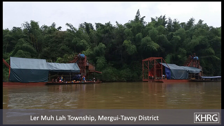 These photos were taken on April 2nd 2017 in Maw Hpo place, K’Hpo area, Ler Muh Lah Township, Mergui-Tavoy District. It shows the Shwey Htun Company’s ships mining for gold and lead on the Ta Naw Th’Ree River. The Ko Cho. Shwey Htun Company has been cooperating with GMS Power Company to mine this river for over a year. The local community is worried about chemical waste from the mining operations flowing into the river, especially mercury. They believe that the companies are mining the river without reporting the impacts to the local authorities. [Photos: Local Villager]