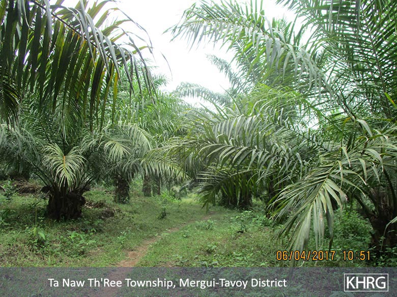 The case of CKB Company[20] in Ta Naw Th’Ree Township highlights how land rights are abused in Mergui-Tavoy District and the efforts that rural communities take to protect themselves from private interests. CKB Company confiscated 325 acres of land from 27 villagers in Ta Naw Th’Ree Township during the conflict period. Their goal was to develop a palm oil plantation. CKB Company forced villagers to leave their homes. After confiscating the land, CKB Company cut down the villagers’ trees. In 2017, villagers have not regained their lands. CKB Company is still planting palm oil trees on the confiscated land.[21]