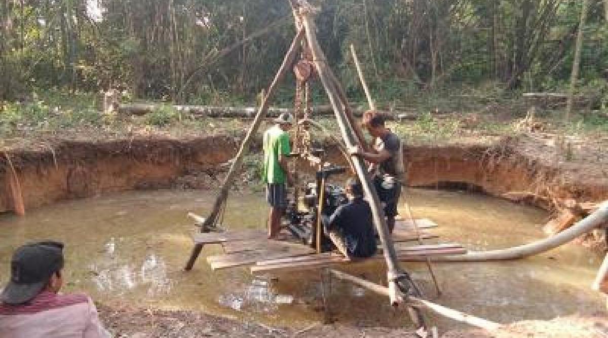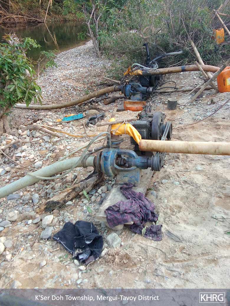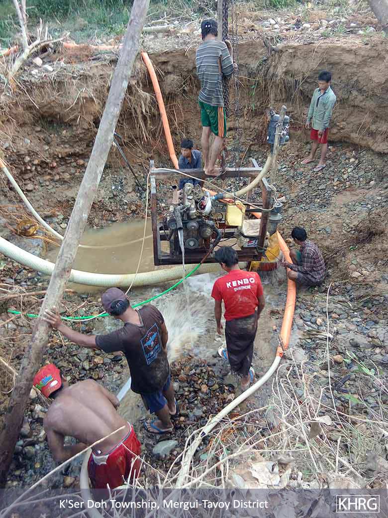 These photos were taken on January 12th 2018 in Htoo Maw village, La Baw sub-area, Kleh Muh Htee main area, K’Ser Doh Township, Mergui-Tavoy District. The photos on the top row show the process of lead mining. The photos on the bottom row show how the lead was mined near a stream. The machine pumps water from the stream and transfers it to the lead mine. It returns the water to the stream, contaminating a local water source. [Photos: KHRG]