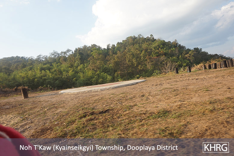 This photo was taken on January 11th 2018 on the hill next to A’Zin village, Kyainseikgyi Township, Dooplaya District. It shows the helicopter landing pad recently built by the Tatmadaw. The Tatmadaw has built many helicopter landing pads in its camps in Dooplaya District. [Photo: KHRG]