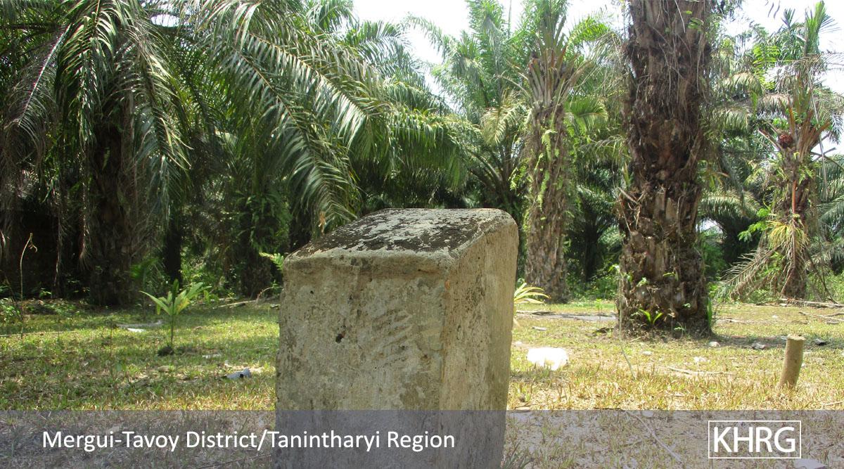 This photo was taken on March 21st, 2019. It shows a stone marker put by the Asia World Company on confiscated land in G--- village, M’Saw Area, Ler Muh Lah Township, Mergui-Tavoy Township. [Photo: KHRG]