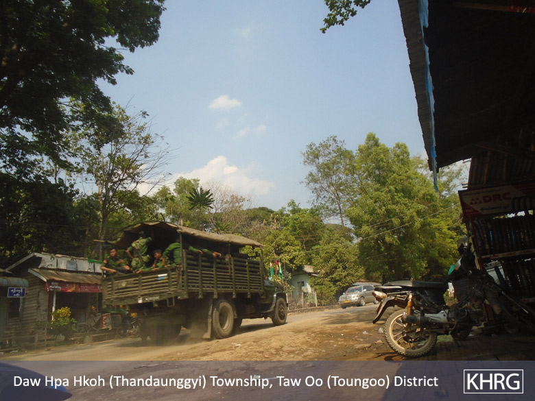 Between January 17th and April 20th 2019, KHRG documented 12 instances of the Tatmadaw transporting rations, ammunition and weaponry, and soldiers between Toungoo and the army camp in Baw G’Lee, Toungoo District. In total, 177 trucks were used for this purpose. Such activity relates to the reinforcement of their army camps and road constructions between Yay Tho Lay in Thandaunggyi Township and Hsa Law Kyoh army camp in Hpapun District.[5] Villagers reported witnessing the transport of ammunition for the air force and large weaponry. Additionally, large weaponry was transported to the Ba Yint Naung Training School in Toungoo District once every three to four months.
