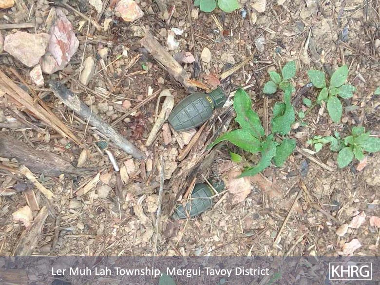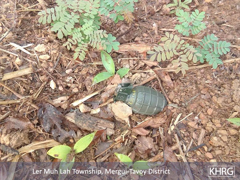 Landmine and UXO contamination remains a problem across large areas of Southeast Myanmar, posing a threat to the local population and preventing a large number of refugees and IDPs from returning to their area of origin. KHRG documented that, in May 2019, the DKBA (splinter group) planted new landmines around eight villages in Hlaingbwe Township, Hpa-an District.[62] Tatmadaw soldiers from the Military Training School (Ta Ta Ka) #12 also left unexploded hand grenades on local villager’s plantations in Ler Muh Lah Township, Mergui-Tavoy District. They came back to destroy them on January 25th 2019, after the local population reported the case to the local authorities.[63]