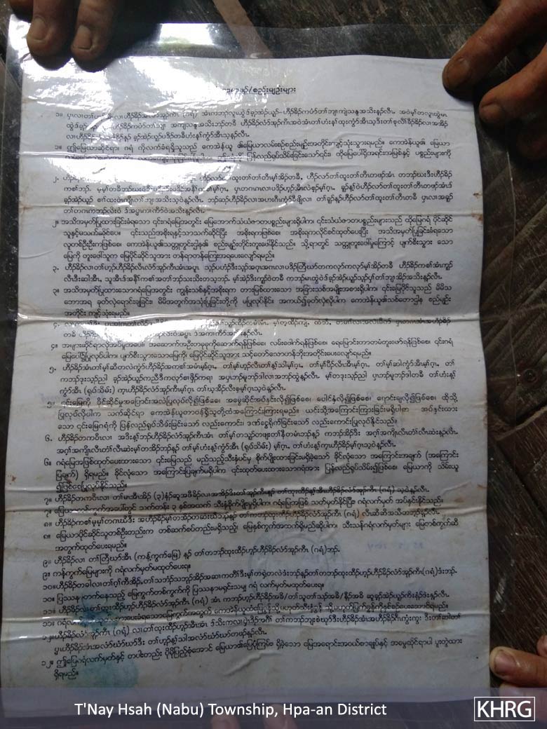 In August 2019, KHRG documented that the KNU/KNLA-Peace Council (KNU/KNLA-PC)[1] had confiscated one acre of land belonging to a local villager in Y--- village, Htoh Kaw Koh village tract, T'Nay Hsah (Nabu) Township, Hpa-An District to build a school playground. The victim did not receive any compensation for the loss of her land, and her attempts to report the case to the local authorities were unsuccessful. She feels powerless and is now worried that more of her lands will be confiscated in the future.[2]