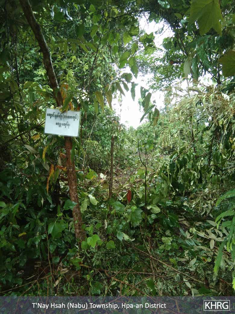 This photo was taken on August 13th 2019 in Y--- village, Htoh Kaw Koe village tract, Ta Nay Hsah Township, Hpa-an District. It shows the sign put by the KNU/KNLA-PC on the confiscated land beside the victim’s farm. [Photo: KHRG]