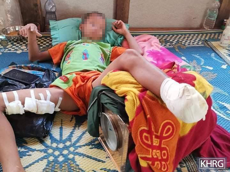 On January 8th 2021 at around 8 am, Saw B---, a 12-year-old boy from A--- village, Ta Maw Daw village tract, Thaton Township, Doo Tha Htoo District stepped on a landmine while collecting Thay T’way [Grewia Polygama] bark[5] in a forest three miles [4.83 km] away from his village with a group of older villagers. His left foot was blown off in the explosion. He also sustained injuries to his right thigh.