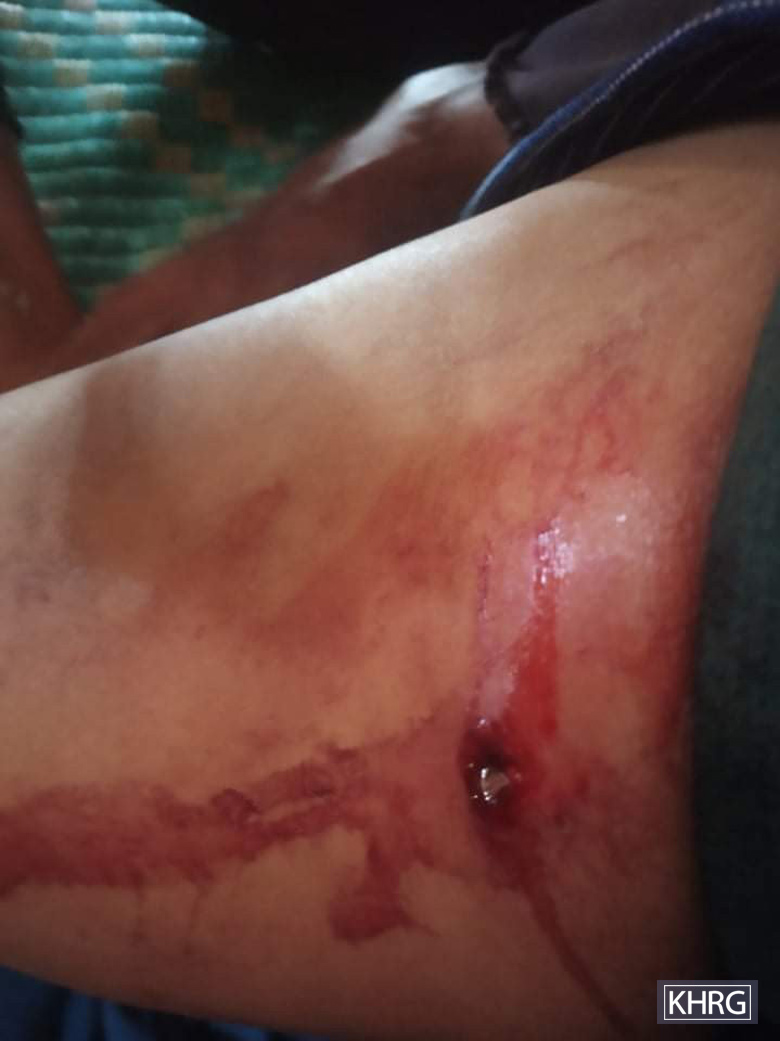 These photos were taken on January 19th 2021 in P--- village, Kheh Der village tract, Ler Doh Township, Kler Lwee Htoo District. The photo on the left shows the shrapnel injuries sustained by Saw R--- after LIB #603 fired a mortar shell into his village. The photo on the right shows Saw R--- being transported to the KDHW clinic in the KNU Ler Doh Township office. [Photos: Villager]