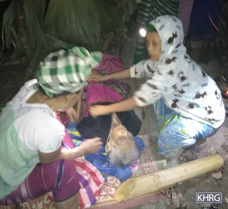 This photo was taken on March 10th 2021 at the W--- displacement site, Kheh Der village tract, Ler Doh Township, Kler Lwee Htoo District. It shows the body of the 78-year-old villager from L--- after she passed away due to her illness. [Photo: KHRG]