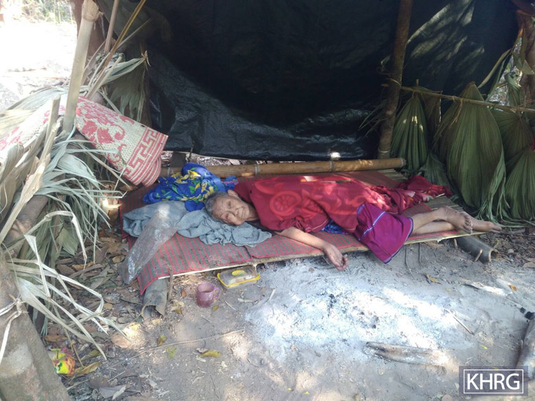 KHRG received this photo from a community member on March 2nd 2021. It show a 78-year-old villager from L--- at the W--- displacement site, Kheh Der village tract, Ler Doh Township, Kler Lwee Htoo District. She was reportedly suffering from an unidentified illness but could not access healthcare services. [Photo: local villager]