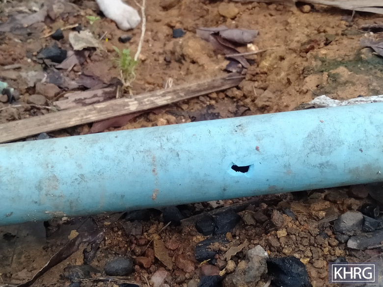 These photos were taken on January 9th 2021 in K--- village, Hkoo Thoo Hta village tract, Dwe Lo Township, Mu Traw District. They show the damage caused by LIB #402’s indiscriminate shelling to local villagers’ plantations, houses and water pipes. [Photos: KHRG]