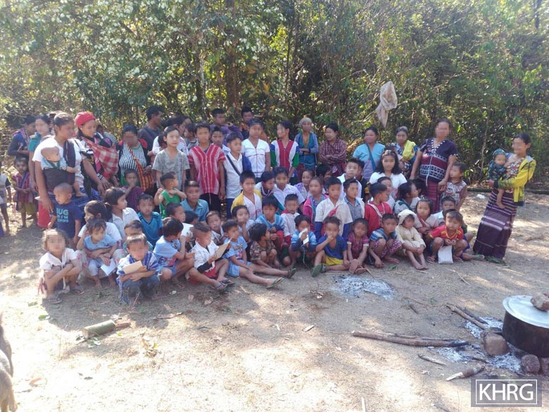 This photo was taken on March 6th 2021 at the W--- displacement site, Kheh Der village tract, Ler Doh Township, Kler Lwee Htoo District. It shows displaced students, teachers, school committee members and villagers from L--- village during the school closing ceremony in the forest. [Photo: KHRG]