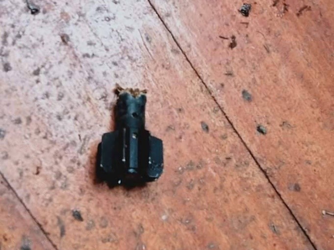 These photos were sent to KHRG by a local villager in D--- village, C--- village tract, Kaw T’Ree Township, Dooplaya District on October 12th 2021. The photo on the left shows a piece of a mortar found in D--- village, while the photo on the right shows the damage done to a local villager’s house by SAC shelling. [Photos: local villager].