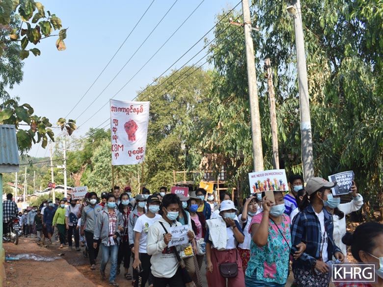 Since the military coup on February 1st 2021,[1] KHRG has interviewed a number of people who have been heavily active in the anti-coup protests. In so many cases, what we find are regular citizens, who, deeply aware of the atrocities committed by the military under previous regimes and the negative impact of military rule on the country, are committed to ending military dictatorship, not just in the present but for all future generations in Myanmar. For many who have taken to the streets, the defence of human rights has become a necessity, a life-or-death situation, where the only choice is to choose to fight: for justice and their future. In order to ensure that these voices are heard, KHRG is publishing several interviews as a news bulletin. The interviews that appear in this news bulletin took place in early March 2021, during a period of heavy protest movements, and at a time when violence and crackdowns against protesters were increasing. Both interviewees evoke the need for protests to continue, and for people to stay united.