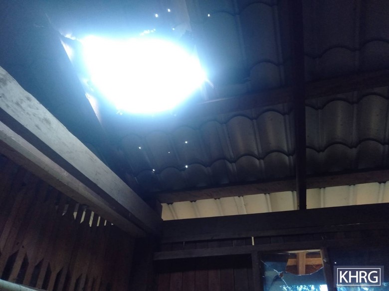 This photo was taken on January 9th 2022 in H--- village, Yo Klah village tract, Bilin Township, Doo Tha Htoo District. This photo shows the roof and window of a villager’s home that were damaged by SAC mortar fire. [Photo: KHRG]