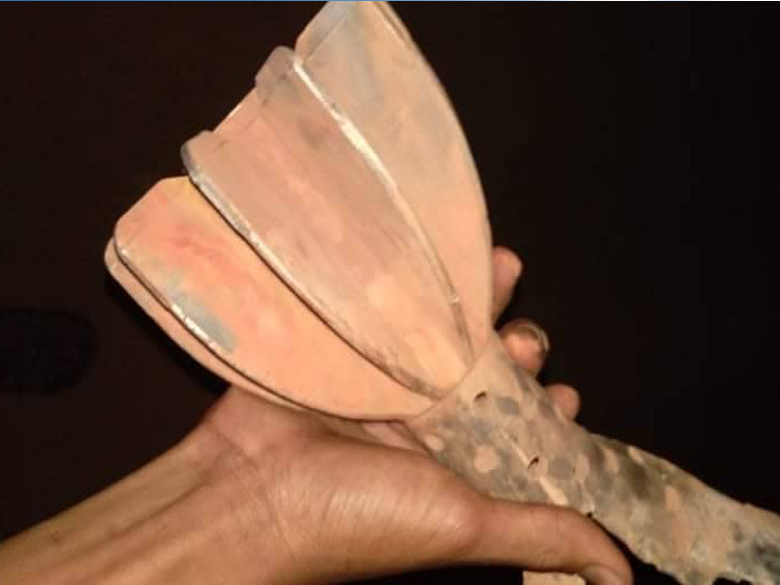 This photo was taken on March 19th 2022 in W---village, T’Maw Daw village tract, Tha Htoo Township, Doo Tha Htoo District. The photo shows a tail fin from a mortar fired by SAC LIB #402. [Photo: Local villager]