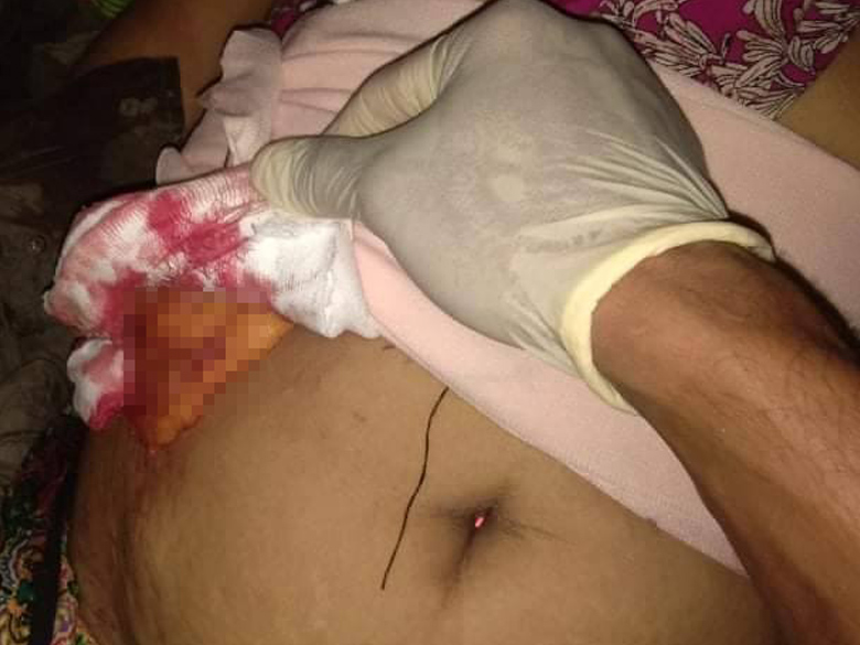 These photos were taken on March 19th 2022 in W--- village, T’Maw Daw village tract, Tha Htoo Township, Doo Tha Htoo District. These photos show two of the villagers injured by SAC mortar shelling. [Photos: Local villager]