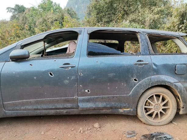 KHRG received these photos on March 23rd 2022. These photos were taken in W--- village, T’Maw Daw village tract, Tha Htoo Township, Doo Tha Htoo District and show a damaged car and motorcycle belonging to local villagers. [Photos: Local villager]