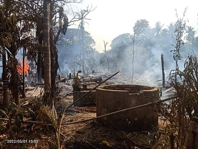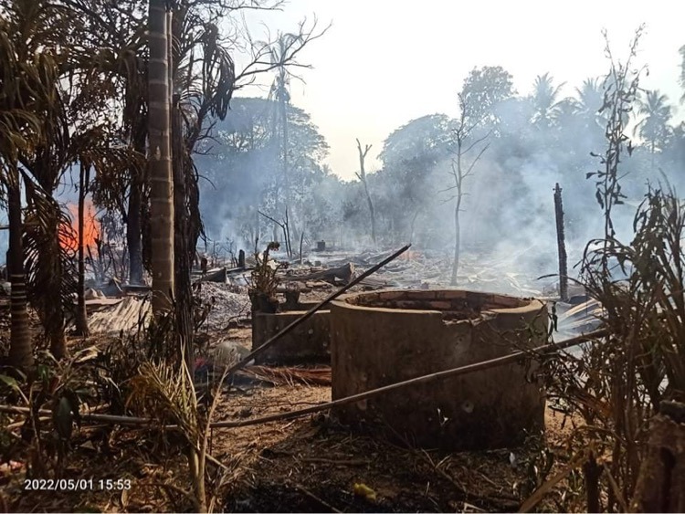 This photo was taken on May 1st 2022 in Lay Kay village, P’Yah Raw village tract, Bilin Township, Doo Tha Htoo District. The photo shows villagers’ houses that were burned down by SAC air strikes earlier that day. [Photo: Local villager]