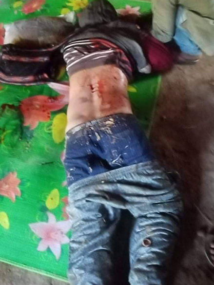 This photo was taken on December 31st 2022 in A--- village, Baw Saw Law area, Daw Hpa Hkoh Township, Taw Oo District. It shows a picture of Saw Aung Thu Ya Than after he was shot by SAC LIB #413 on December 31st 2022. He died ten minutes after the bullet hit his lower back. [Photo: Local villager]
