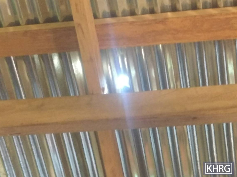 These photos were taken in November 2022 in Than Moe Taung village, Than Moe Taung village tract, Daw Hpa Hkoh Township, Taw Oo District. The two upper photos show bombs that SAC fighter jets dropped in the village. The bottom left photo shows villagers’ plantations that were damaged by the air strike. The bottom right photo shows a roof of one villager’s house damaged by the air strike. [Photos: KHRG]