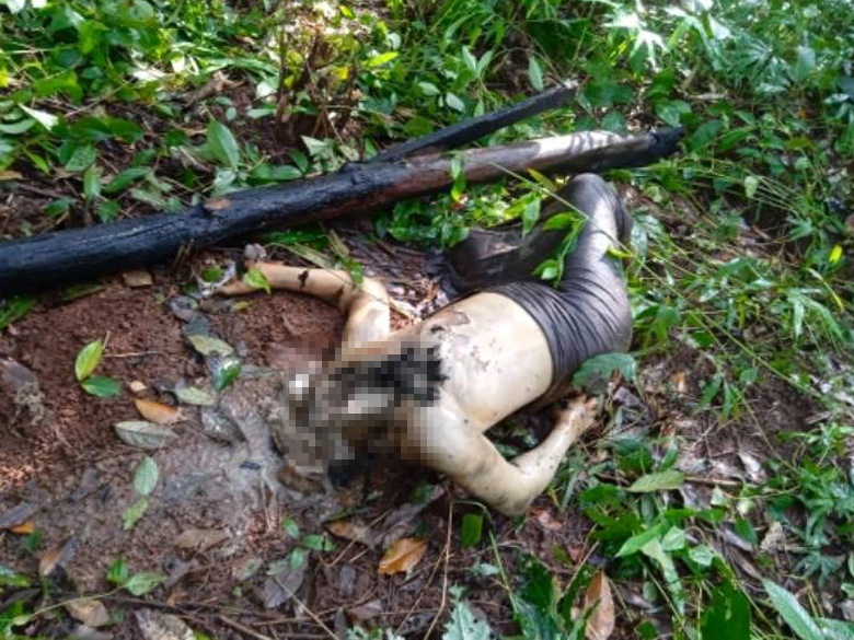 This photo was taken on April 19th 2023 in Ee--- area, Per Htee area, Htaw Ta Htoo Township, Taw Oo District. This photo shows the corpse of two villagers that were shot and killed by SAC LID #22 on April 7th 2023. [Photo: KHRG]