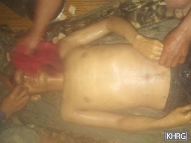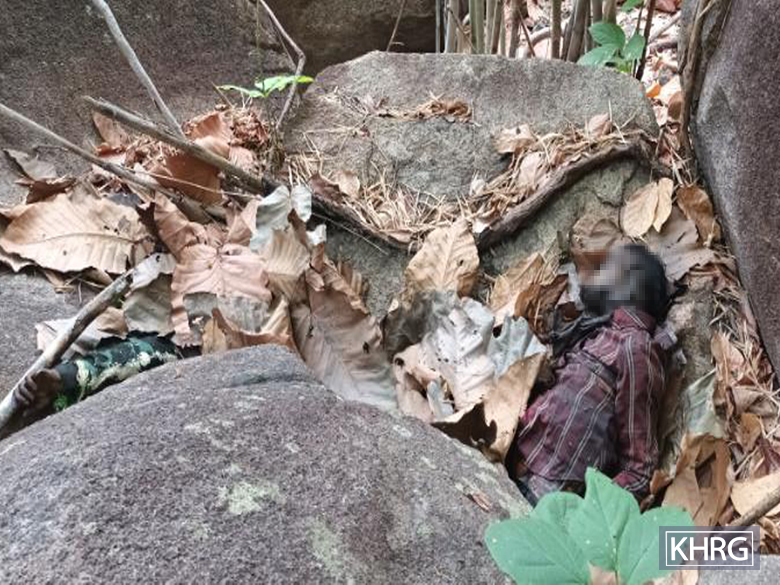 The photo was taken on February 8th 2023 at a displacement site in Saw Muh Plaw village tract, Lu Thaw Township, Mu Traw District, where Y--- villagers displaced to. It shows Saw W---’s corpse after he was killed by SAC soldiers while hunting in a nearby forest. [Photo: KHRG]