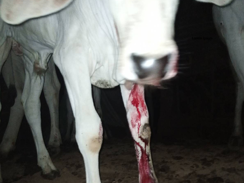 The photo on the top left shows villagers’ rice mixed with chillies and turmeric by the SAC [so that villagers are unable to eat it]. The photo on the top right shows a villager’s house damaged by the SAC shelling in Nah Tha Kway village tract, Moo Township. The two photos at the bottom show a villager’s cows injured from mortar shrapnel. The two photos at the top were taken by KHRG on March 28th 2023. The two photos at the bottom were received from a Kler Lwee Htoo District KNU researcher on March 28th 2023. [Photos: KHRG/KNU]