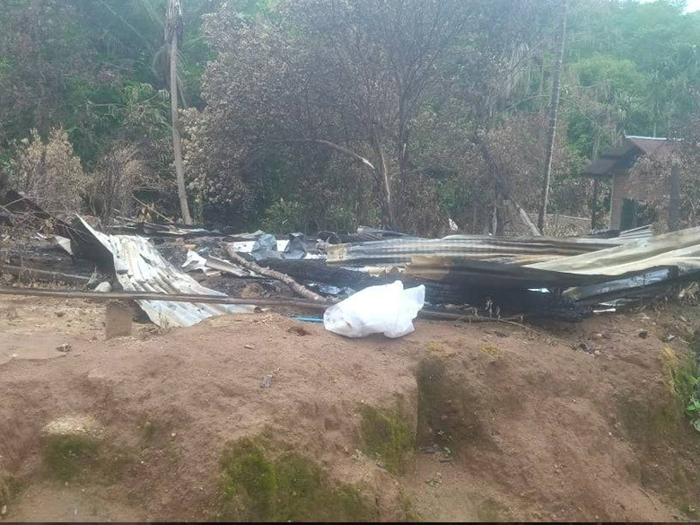 These photos were taken the first week of July 2023 in T'See Ther Mee Lar Town, Daw Hpa Hkoh Township, Taw Oo District. It shows the body of Saw W---, who was killed by the SAC, as well as burned houses after the skirmish happened between SAC and PDF on July 7th 2023. [Photos: Local villager]