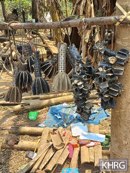 This photo was taken on March 17th 2023 in Da--- village, Meh Klaw village tract, Bu Tho Township, Mu Traw District. It shows a large number of tail fins, remnants of exploded mortars which have been collected by a local villager from his village since the February 2021 coup. [Photo: KHRG]