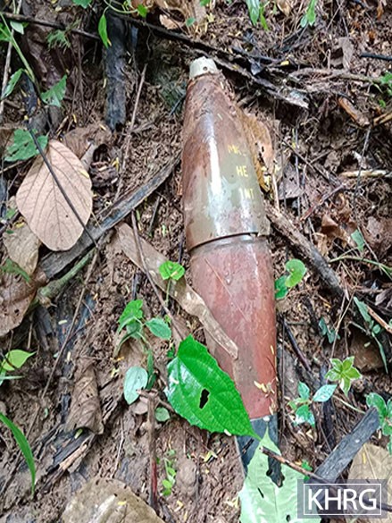 This photo was taken on July 12th 2023 on a farm between Db--- and Dc--- village, Hkaw Poo village tract, Bu Tho Township. It shows an unexploded 120MM mortar that was shelled by SAC. [Photo: KHRG]