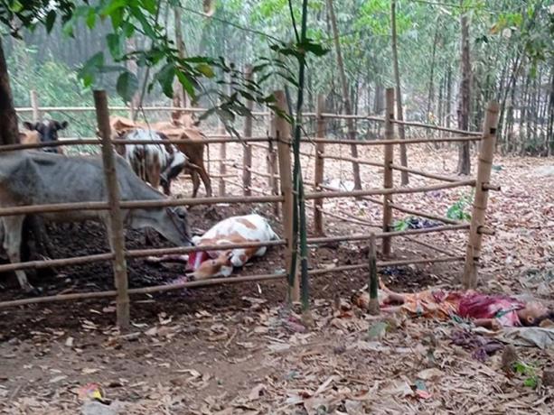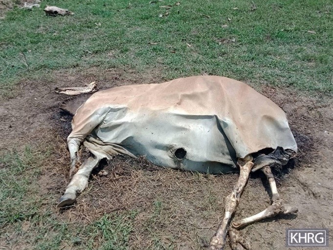 This photo was taken on May 27th 2023 in Sa Win Kyun Taung village, Mo Twin village tract, Moo Township, Kler Lwee Htoo District. It shows a dead cow, killed by SAC shelling that also destroyed five houses and displaced villagers. [Photo: KHRG]