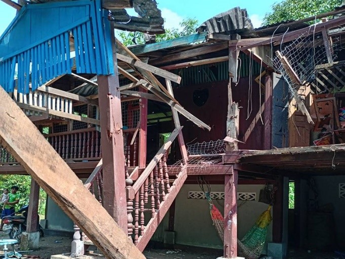 KHRG received this photo from a local villager on August 2nd 2023. It shows a villager’s house destroyed by SAC shelling 120MM mortars into Kya Inn Kon village, Ywa Ta Shin village tract, Kaw T’Ree Township, Dooplaya District on May 27th 2023. [Photo: Local villager]