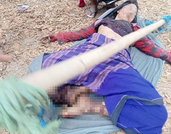 This photo was taken on February 23rd 2023 in Cd--- village, Pyin Yay village tract, Hsaw Htee Township, Kler Lwee Htoo District. It shows 35-year-old Naw Ac--- who died from shelling by SAC LIB #20. [Photo: Local villager]
